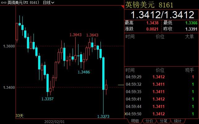 英镑兑美元收低1.36%至1.3412,创2021年12月22日以来新低至1.3273。俄罗斯与西方国家在乌克兰问题上对峙之际,投资者对英镑持谨慎态度。英国央行官员有关未来利率的评论也令英镑短线承压。