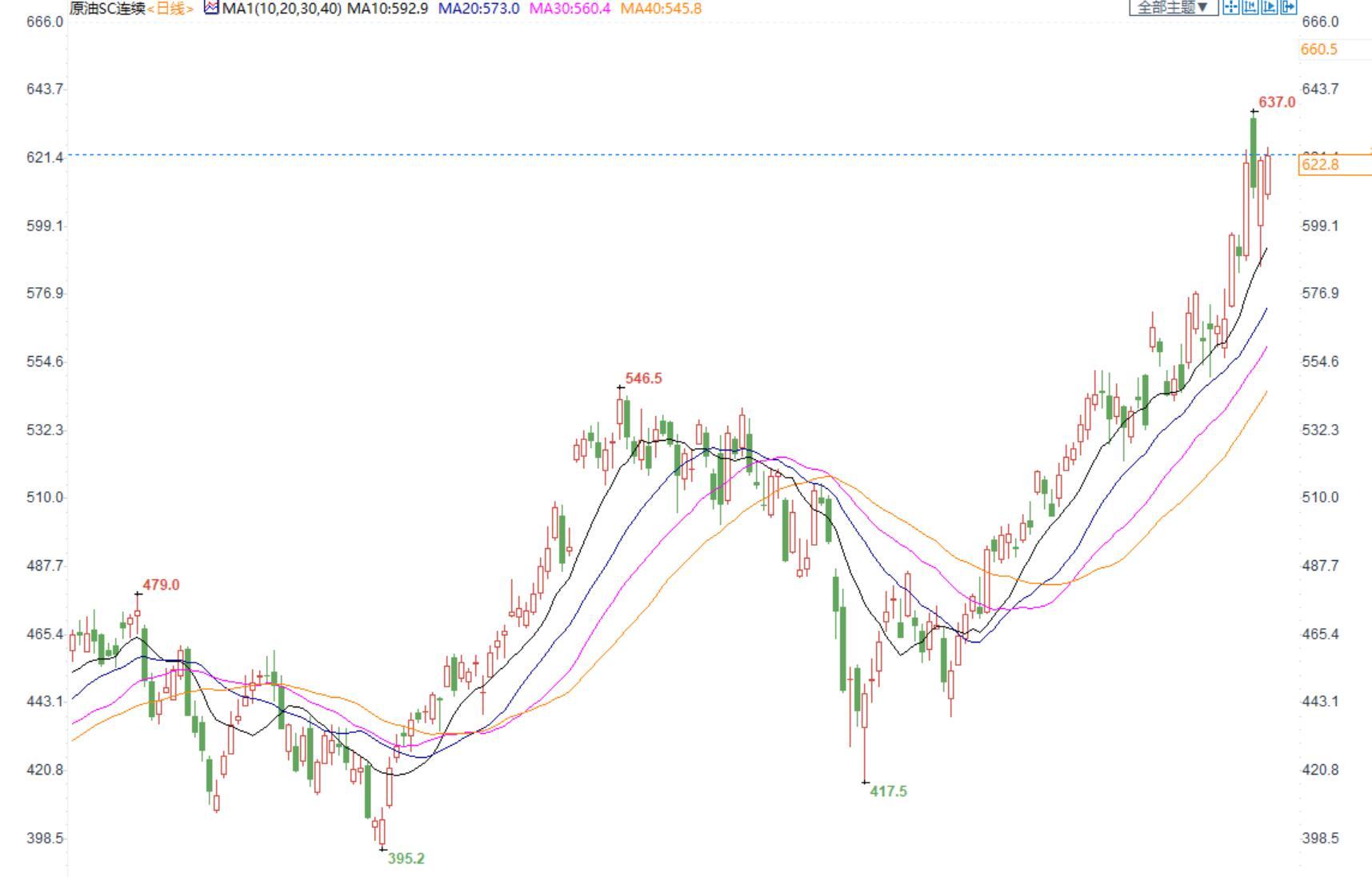 周二(3月1日)上海原油价格上涨3.94%,主力合约2204终盘收于622.8元/桶,涨23.6元/桶,地缘紧张局势升温支持油价,OPEC并没有增产意愿导致供需不平衡支持油价。