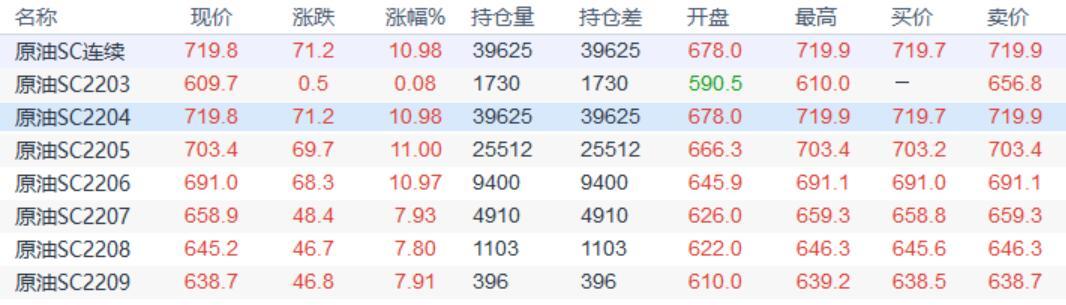 周四(3月3日)上海原油价格上涨10.98%,主力合约2204终盘收于719.8元/桶,涨71.2元/桶,地缘紧张局势升温,对俄制裁打压供给支持油价。