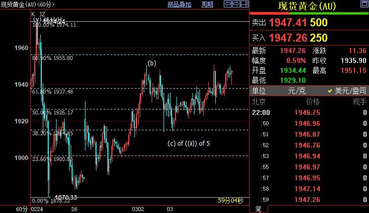 日线上看,金价自1779美元开启上行5浪走势。小时图上看,金价可能自1950美元开启调整(c)浪,但(c)浪走势料收敛,在(a)浪38.2%斐波那契回档位1915美元站稳。(a)浪和(c)浪是自1974美元开启的调整((ii))浪子浪,((ii))浪是5浪的子浪。
