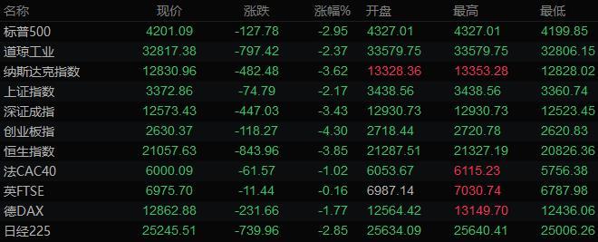 美股收盘情况:标普500指数下跌3%,报4201.09点;道琼斯工业平均指数下跌2.4%,报32817.38点;纳斯达克综合指数下跌3.6%,报12830.96点;纳斯达克100指数下跌3.8%,报13319.38点;罗素2000指数下跌2.4%,报1953.048点。