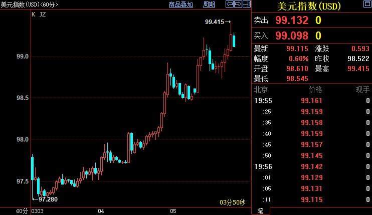 北京时间19:55,现货黄金上涨1.08%至1991.28美元/盎司;COMEX期金主力合约上涨1.49%至1996.0美元/盎司;美元指数上涨0.66%至99.147。