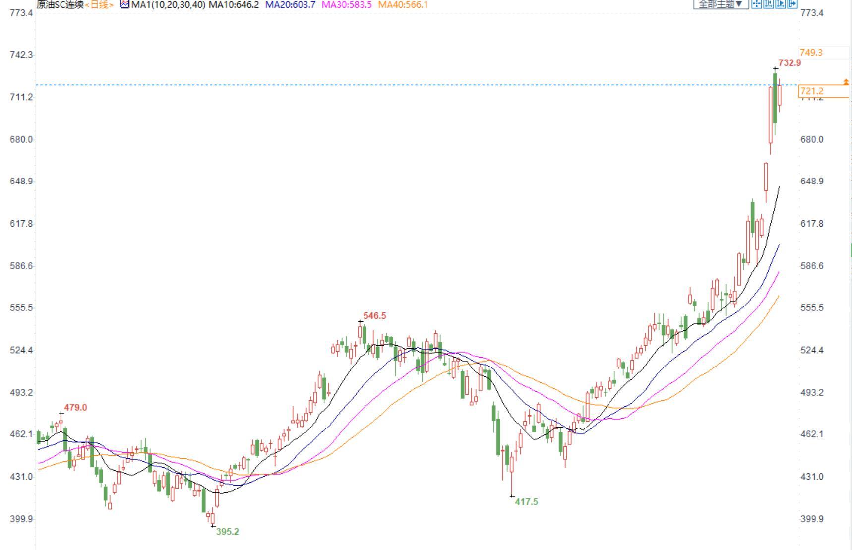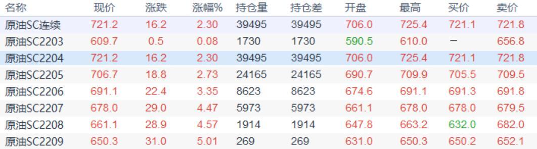 周一(3月7日)上海原油价格小幅上涨2.30%,主力合约2204终盘收于721.20元/桶,涨16.2元/桶,市场对俄罗斯和乌克兰冲突造成的供应中断以及俄罗斯石油和天然气禁令的可能性做出反应。