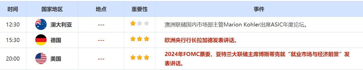 此外,投资者还需关注芝加哥联储主席埃文斯,亚特兰大联储主席博斯蒂克发表的讲话。