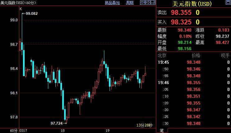北京时间19:45,现货黄金上涨0.22%至1925.67美元/盎司;COMEX期金主力合约下跌0.15%至1926.5美元/盎司;美元指数上浮0.11%至98.352。