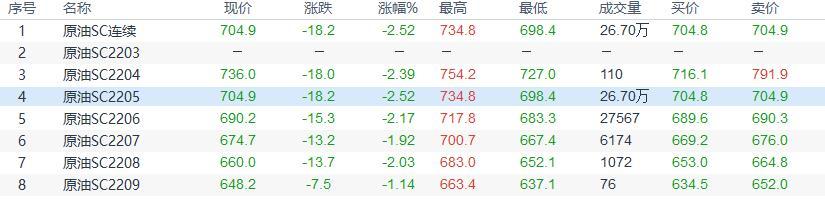 周一(3月28日)上海原油价格收盘下跌18.2,跌幅2.52%。主力合约2205终盘收于704.9元/桶,跌18.2元/桶。油价收跌,主要因全球疫情严峻,且消息称俄罗斯准备继续扩大原油出口。