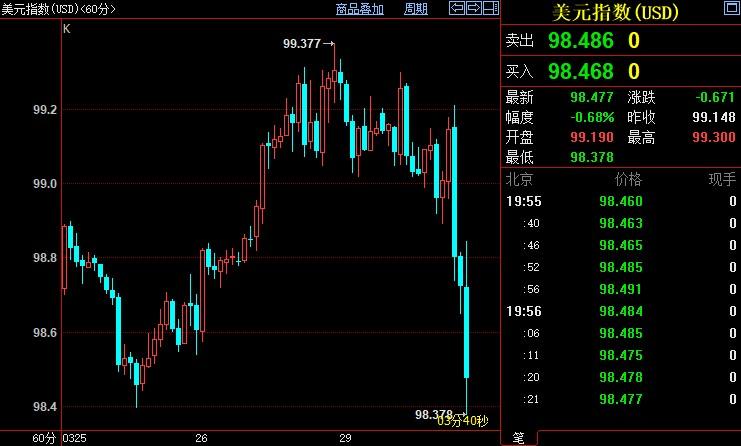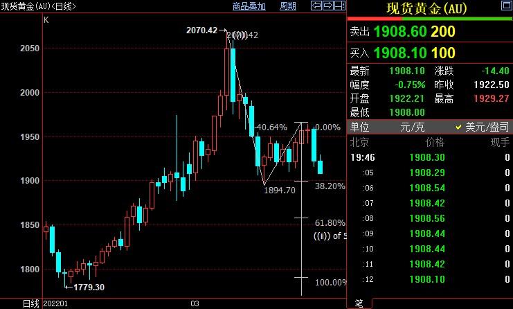 北京时间19:54,现货黄金下跌0.83%至1906.67美元/盎司;COMEX期金主力合约下跌1.85%至1904.0美元/盎司;美元指数下跌0.73%至98.405。