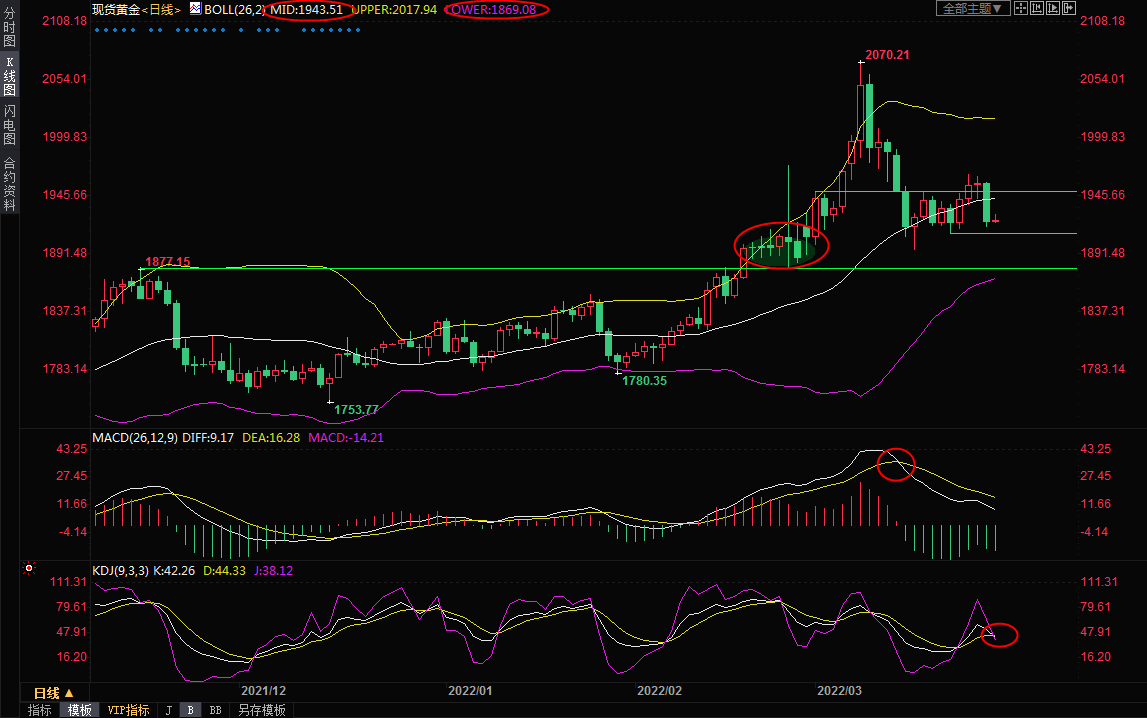 鉴于KDJ也发出短线超卖信号,若金价坚守布林线下轨支撑,并反弹至布林线中轨1941.20上方,则削弱短线看空信号。