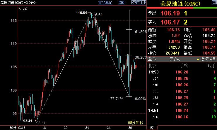 北京时间14:51,NYMEX原油期货上涨1.94%至106.26美元/桶;ICE布伦特原油期货上涨1.72%至109.56美元/桶。