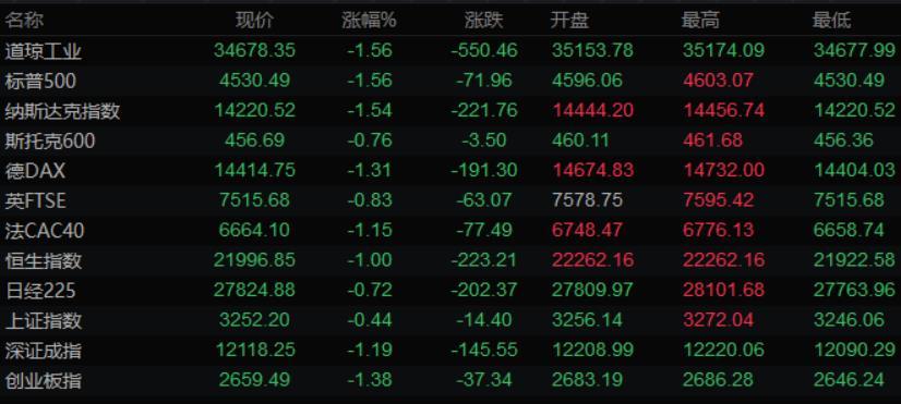 美股收盘情况:道琼斯指数收盘下跌550.82点,跌幅1.56%,报34677.99点;标普500指数收盘下跌63.15点,跌幅1.37%,报4539.30点;纳斯达克综合指数收跌221.76点,跌幅1.54%,报14220.52点。