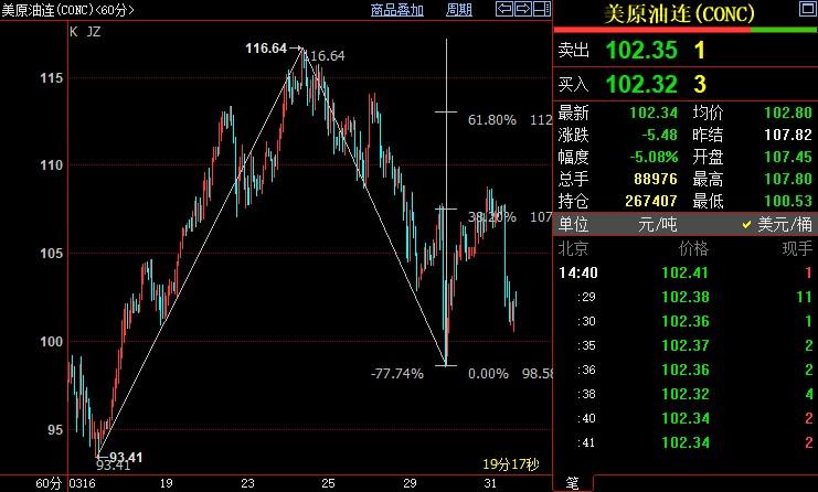 北京时间14:42,NYMEX原油期货下跌5.01%至102.42美元/桶;ICE布伦特原油期货下跌3.96%至107.03美元/桶。