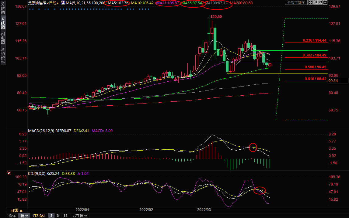 但目前55日均线给油价提供支撑,需要留意反弹力度,5日均线阻力在102.75附近,21日均线阻力在106.86附近,若意外顶破该阻力,则增加后市看涨信号。