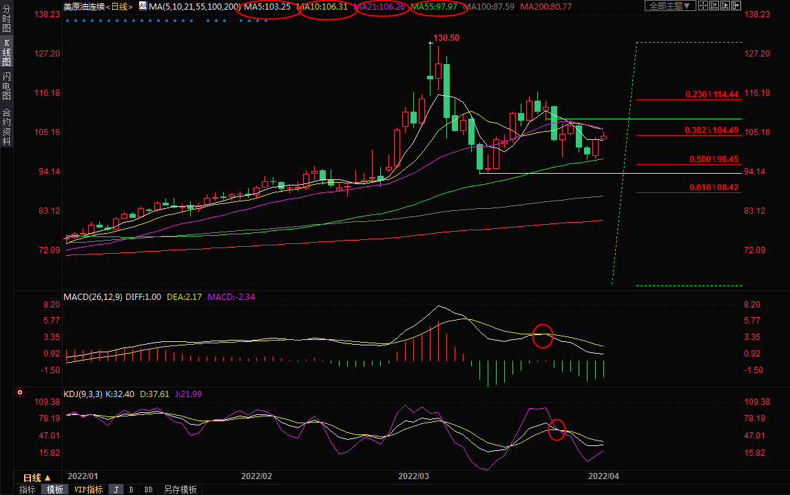 日线级别:震荡;油价此前在55日均线附近获得支撑,上方受到21日均线的压制,目前两根均线分别在97.98和106.28,短线留意该区域的突破情况。