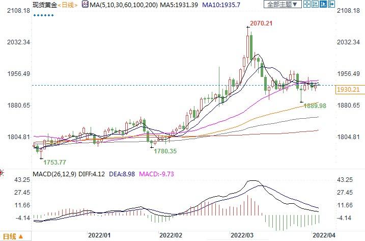 北京时间4月5日10:00 现货黄金 报 每盎司1930.21美元