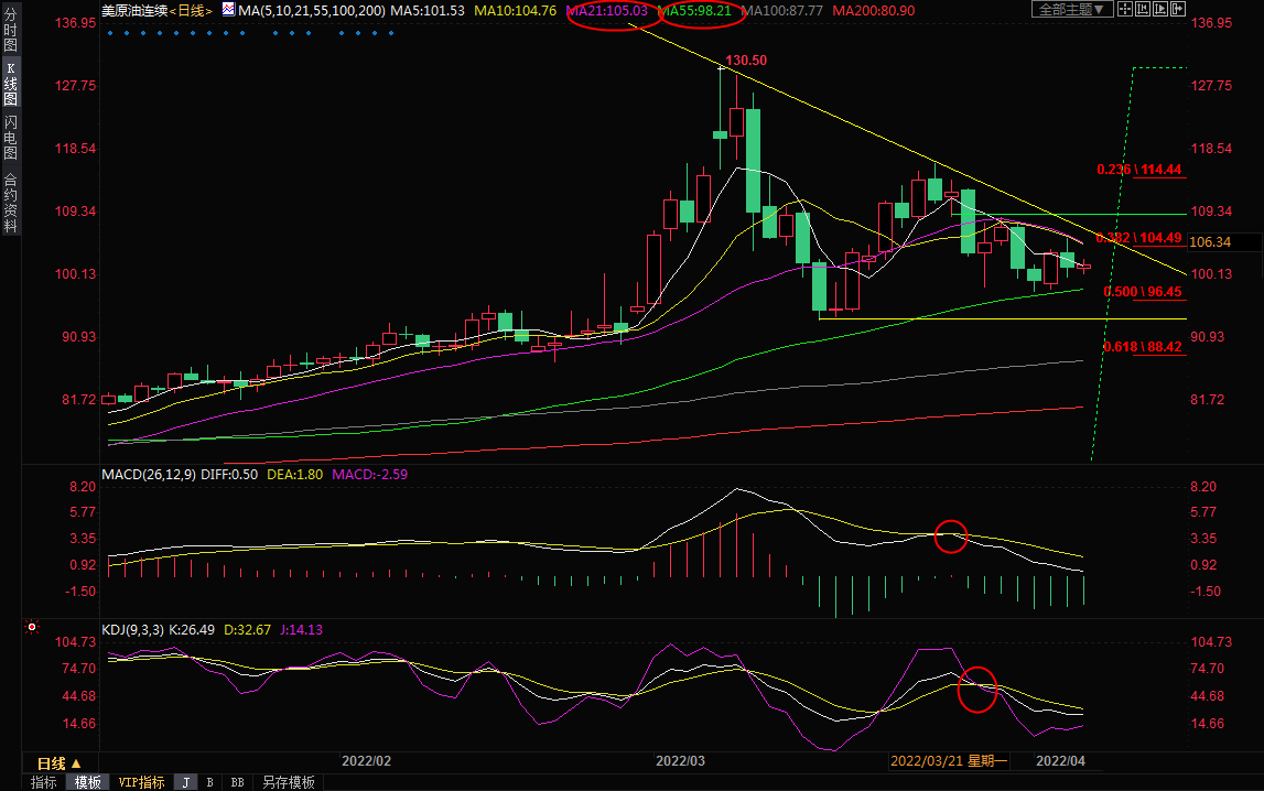 日线级别:震荡;21日均线对油价压制明显,MACD死叉运行,KDJ轻微死叉,短线略微偏向震荡下行,继续关注55日均线附近支撑,目前在98.21附近,一旦失守该支撑,可能会进一步试探3月15日低点93.53附近支撑。短线的话,100整数关口附近也存在一些心理支撑。