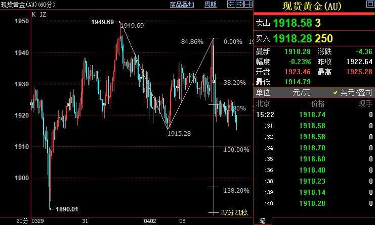 北京时间15:23,现货黄金下跌0.26%至1918.58美元/盎司;COMEX期金主力合约下跌0.31%至1921.5美元/盎司;美元指数上浮0.12%至99.609。