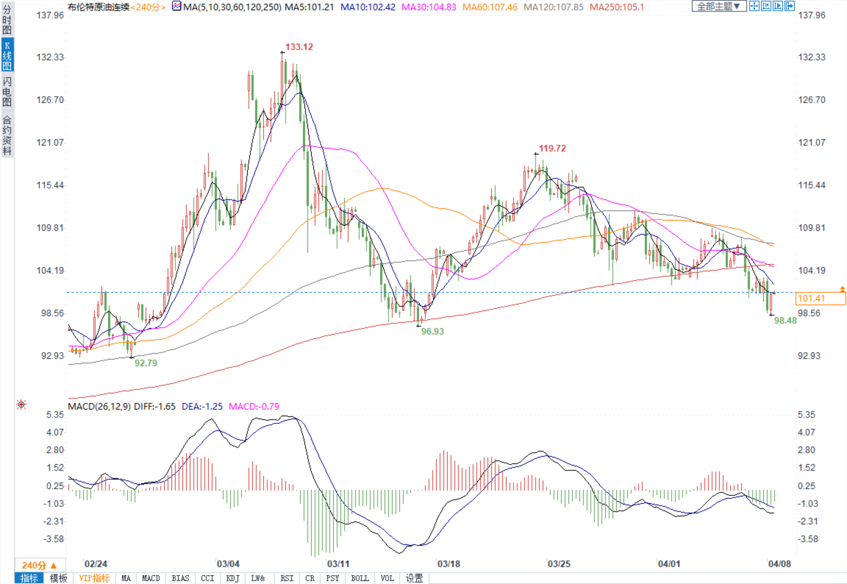 周四(4月7日)尾盘上涨0.16%,报收97.16美元/桶,盘中一度跌至93.81美元,为3月16日以来新低。早前国际能源署(IEA)公布1.2亿桶石油释放计划细节,英国将释放441万桶原油储备;德国将释放648万桶原油储备;法国将释放605万桶原油储备,令油价一度跌至近3周低位。