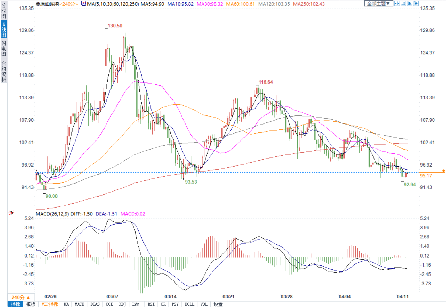 周一(4月11日)布油期货下跌4.2%,结算价报98.48美元/桶,为3月16日以来的最低收盘价。此前包括美国在内的国际能源署成员国将在未来六个月释放2.4亿桶石油。摩根大通分析师称,未来六个月战略石油储备(SPR)的释放量为每日130万桶,足以抵消俄罗斯每日100万桶的石油供应缺口。与此同时,美元兑一篮子货币连续第八个交易日走强,令原油价格承压。美元走强使得石油对其他货币的持有者来说更加昂贵。