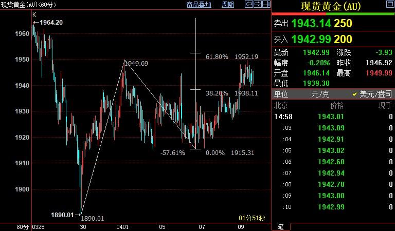 北京时间14:58,现货黄金xiadie 0.22%至1942.98美元/盎司;COMEX期金主力合约上浮0.03%至1946.2美元/盎司;美元指数上涨0.17%至100.019。