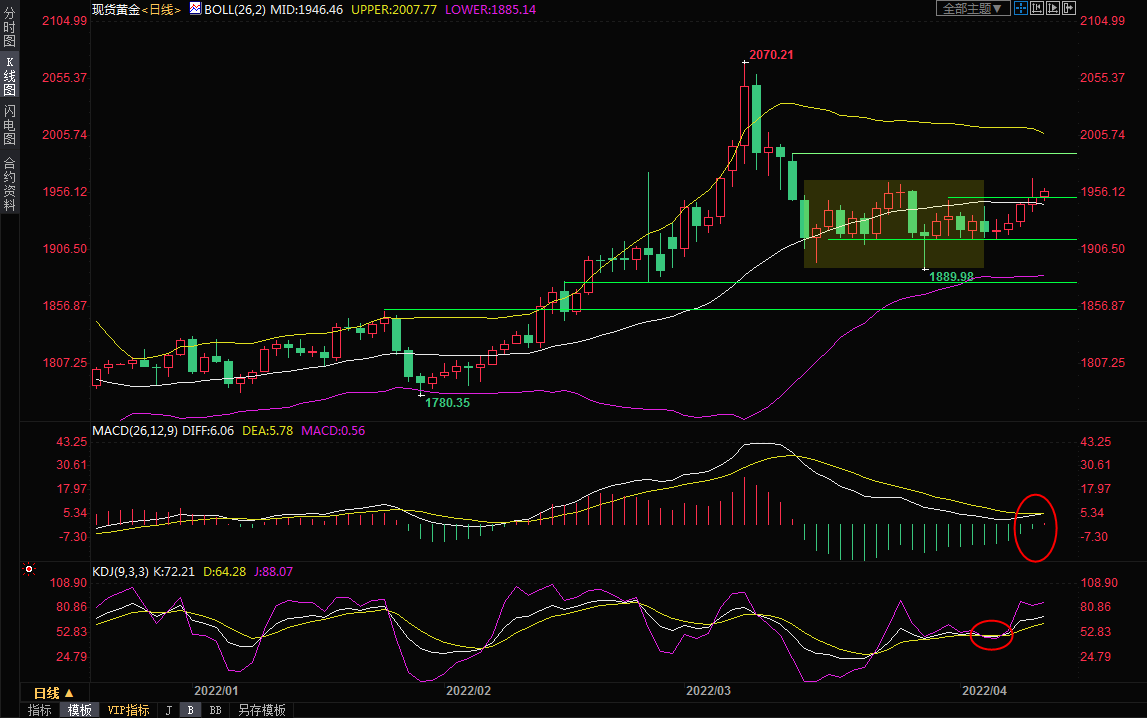 布林线中轨1946已经转化为初步支撑所在,21日均线支撑在1934.88附近,若回落至该位置下方,则削弱短线看涨信号。