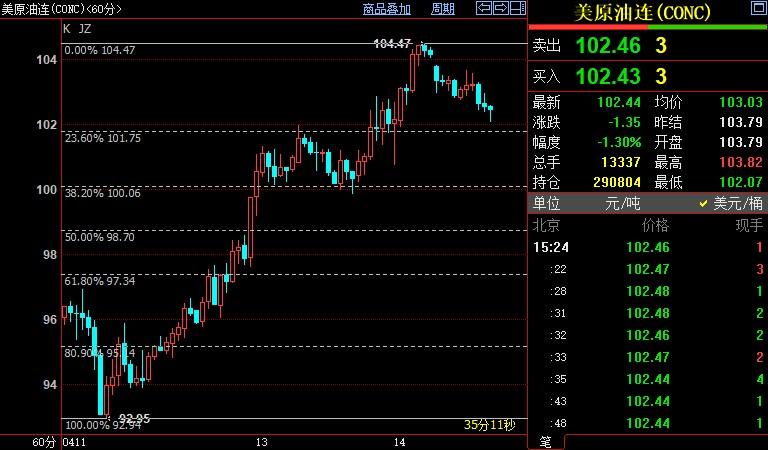 北京时间15:25,NYMEX原油期货下跌1.33%至102.86美元/桶;ICE布伦特原油期货下跌1.18%至107.50美元/桶。