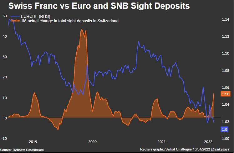 由乌克兰冲突引发的避险操作迫使瑞士央行加强外汇干预,在过去的三周里,瑞士的活期存款增加了80亿瑞郎(85.8亿美元)。