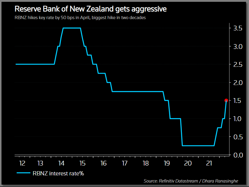 该央行将官方隔夜拆款利率(OCR)上调50个基点至1.5%,这是该央行逾20年来幅度最大的一次加息,也是本周期内的第四次上调,并维持其对2023年底利率将达到3.35%左右的预测。