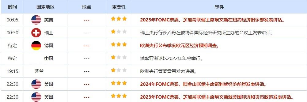 4月20日,投资者还需关注旧金山联储主席戴利和芝加哥联储主席埃文斯就美国经济前景发表的讲话。