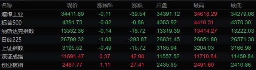 美股收盘情况:道琼斯工业指数下跌39.54点,至34411.69点,跌幅0.11%;标普500指数微幅0.9点,至4391.69点,跌幅0.02%;纳斯达克指数下跌18.72点,跌幅0.14%,至13332.36点。