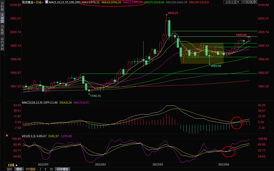 下方初步支撑在5日均线1976.22附近,3月24日高点支撑在1966.03附近,如果金价冲高受阻后回落至该位置下方,则削弱短线看涨信号;10日均线支撑在1956.23附近21日均线支撑在1945.05附近。