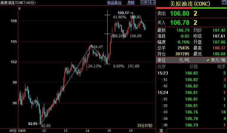 北京时间15:24,NYMEX原油期货下跌0.73%至106.85美元/桶;ICE布伦特原油期货下跌0.59%至112.49美元/桶。