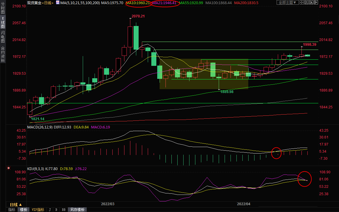 日线级别:震荡上涨;MACD金叉,KDJ有死叉趋势,金价此前在2000整数关口附近受阻,短线走势变数增加,如果本交易日录得阴线,则增加震荡筑顶的风险,关注10日均线1960附近支撑,一旦失守该支撑,则增加短线看空信号;进一步支撑在21日均线1946.42附近。