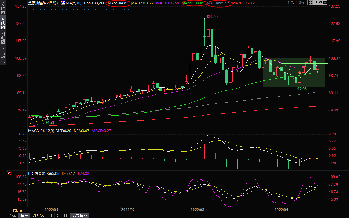 鉴于油价在110关口附近受阻后大幅下挫,短线下行风险略高一点,如果失守55日均线100.69附近支撑,则油价可能油价可能会重新跌向93关口附近,甚至是100日均线,目前100日均线在89.94附近。