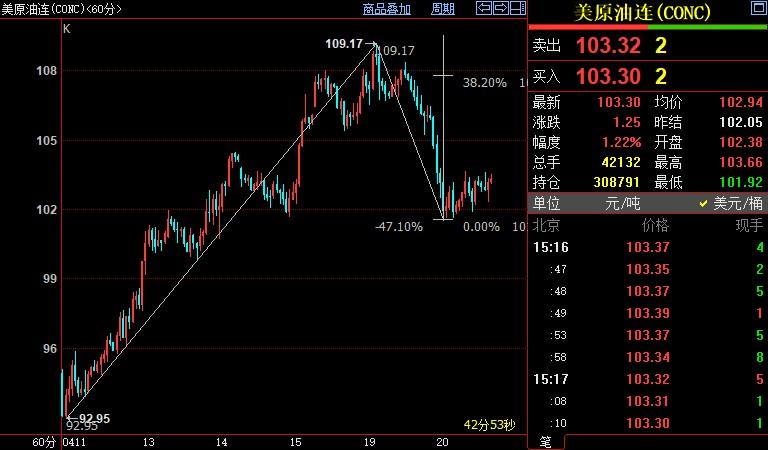 北京时间15:17,NYMEX原油期货上涨1.32%至103.41美元/桶;ICE布伦特原油期货上涨1.32%至108.67美元/桶。