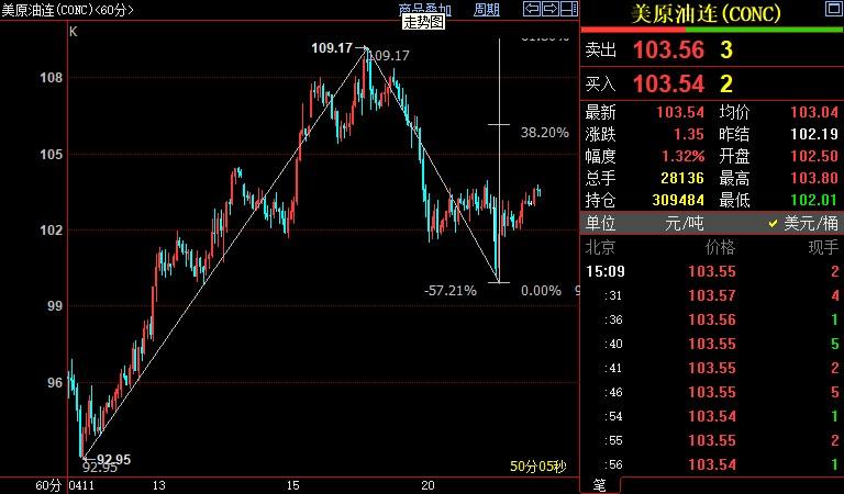 北京时间15:10,NYMEX原油期货上涨1.31%至103.53美元/桶;ICE布伦特原油期货上涨1.42%至108.32美元/桶。
