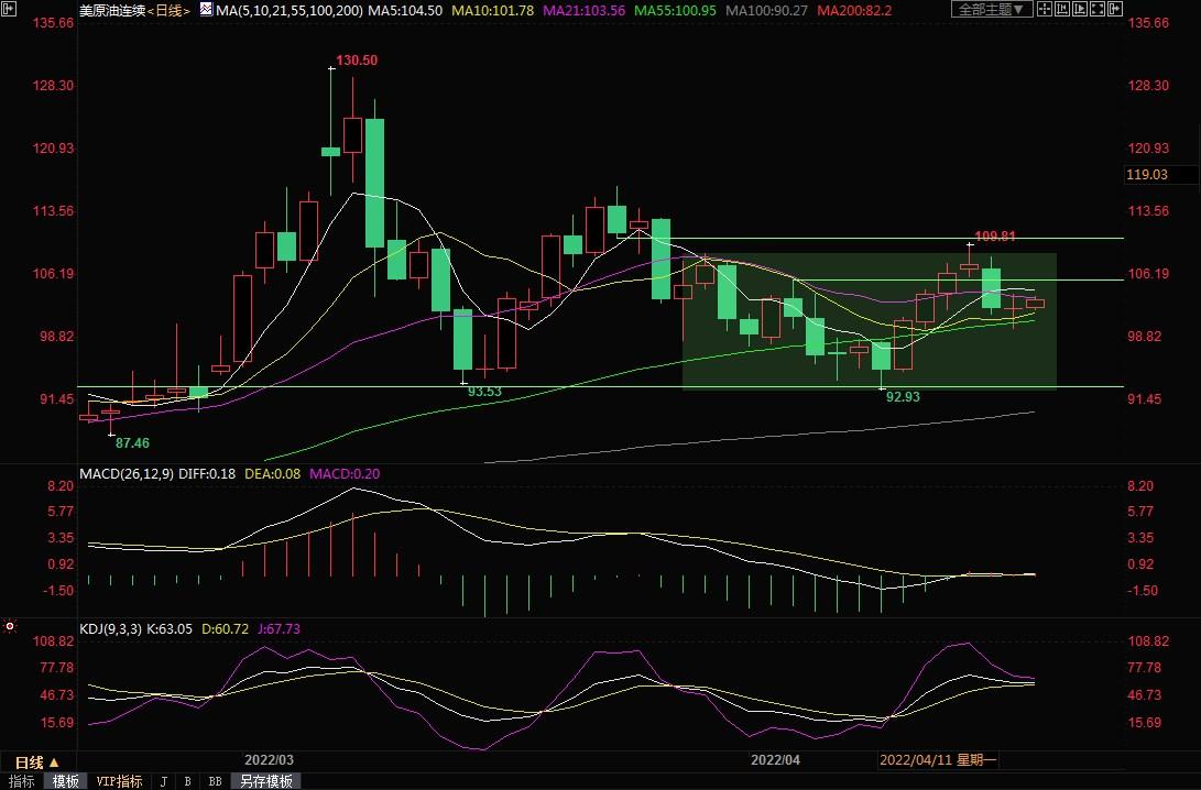 鉴于周四油价探底回升,100关口和55日均线失而复得,短线略微偏向多头,进一步阻力在4月5日高点105.59附近,若能顶破该阻力,则增加短线看涨信号。