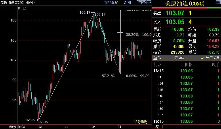 北京时间16:15,NYMEX原油期货下跌0.68%至103.07美元/桶;ICE布伦特原油期货下跌0.72%至107.55美元/桶。