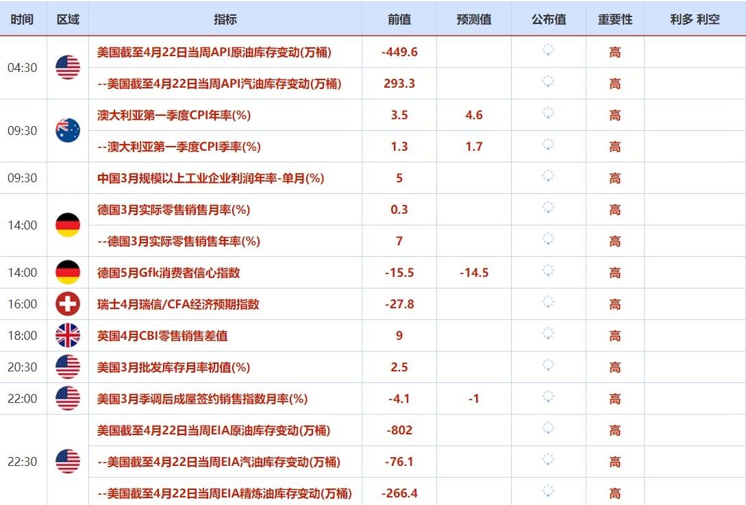 值得注意的是,4月29日,中国上期所、大商所、郑商所、上金所因劳动节,不进行夜盘交易。日本东京证券交易所,昭和之日,休市一日。