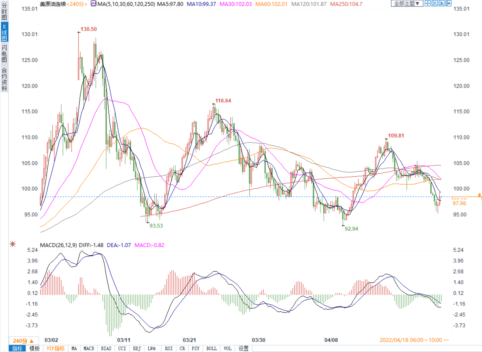 周一(4月25日)布油期货下跌4.1%,结算价报收102.32美元/桶;两大原油指标均创4月11日以来的最低收盘水平。自3月初急升至2008年来最高以来,已骤降约25%。这导致美国投机客上周将其期货和期权净多头头寸削减至2020年4月以来的最低水平。同样令油价承压的是,美元兑一篮子货币升至两年高位,受美国大幅加息的可能性推动。强势美元使石油对其他货币持有者来说更加昂贵。