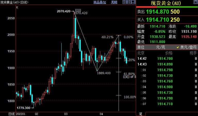 北京时间14:43,现货黄金下跌0.82%至1915.12美元/盎司;COMEX期金主力合约下跌0.95%至1915.7美元/盎司;美元指数上涨0.54%至101.664。