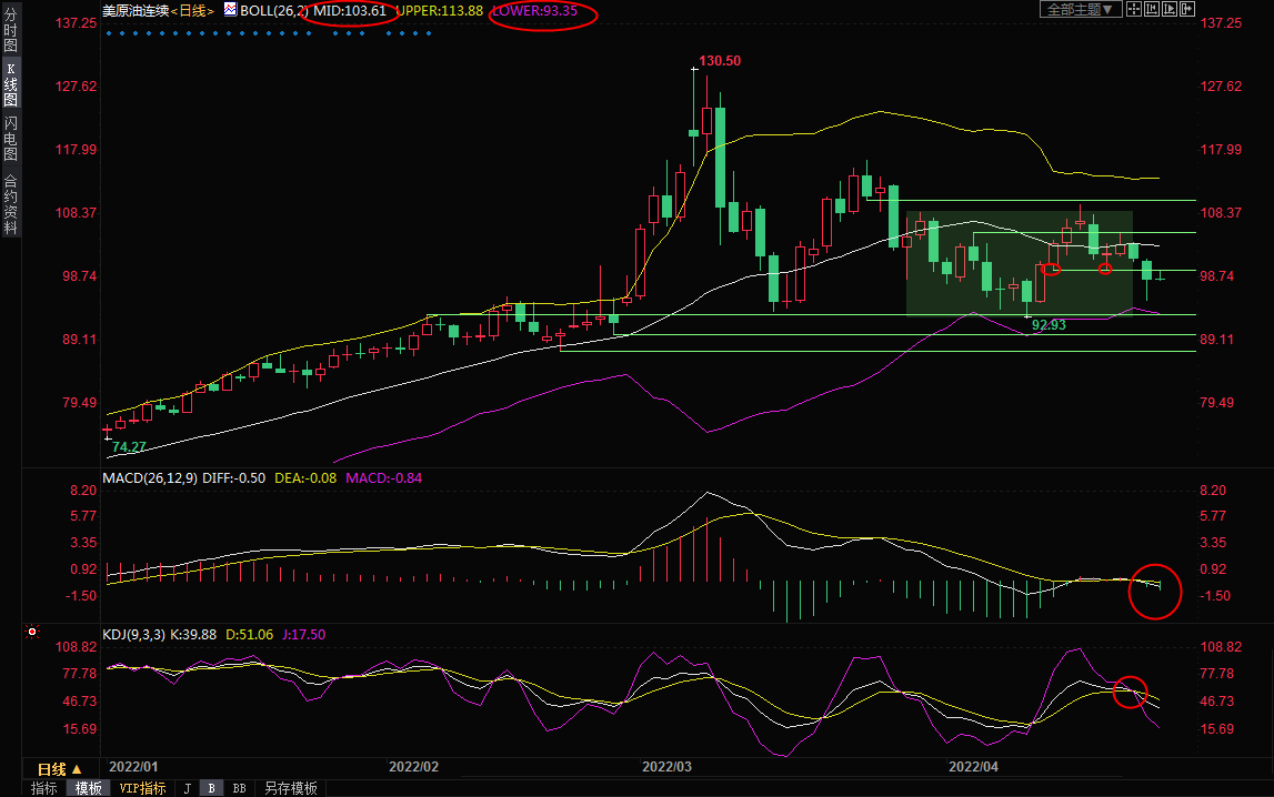 日线级别:震荡下跌;MACD死叉信号加强,KDJ死叉,目前失守了100整数关口和4月22日低点99.88附近支撑,短线偏向空头,继续关注布林线下轨附近支撑,目前该支撑在93.39附近,然后是100日均线91.27附近支撑,2月25日低点支撑在90.06附近,2月18日低点支撑在87.46附近。
