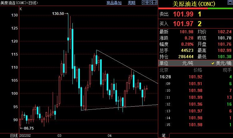 北京时间16:28,NYMEX原油期货上浮0.25%至101.95美元/桶;ICE布伦特原油期货上浮0.38%至104.99美元/桶。