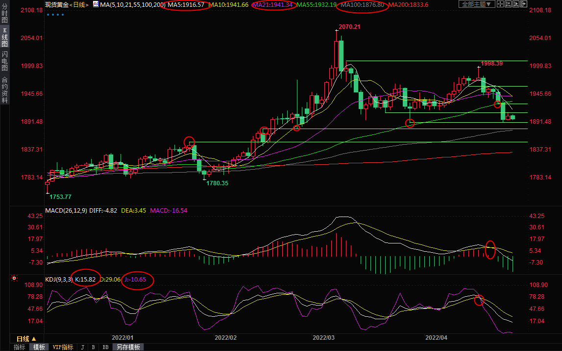 鉴于KDJ的K值和J值已经发出超卖信号,如果金价意外回升值5日均线1916.54上方,则削弱短线看空信号,进一步强支撑在4月22日低点1926.55附近。