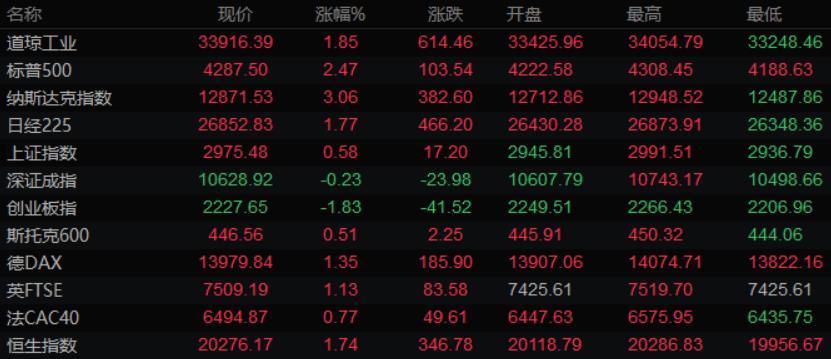 美股收盘情况:标普500指数上涨2.5%,报4287.5点;道琼斯工业平均指数上涨1.9%,报33916.39点;纳斯达克综合指数上涨3.1%,报12871.53点;纳斯达克100指数上涨3.5%,报13456.06点;罗素2000指数上涨1.8%,报1917.944点。