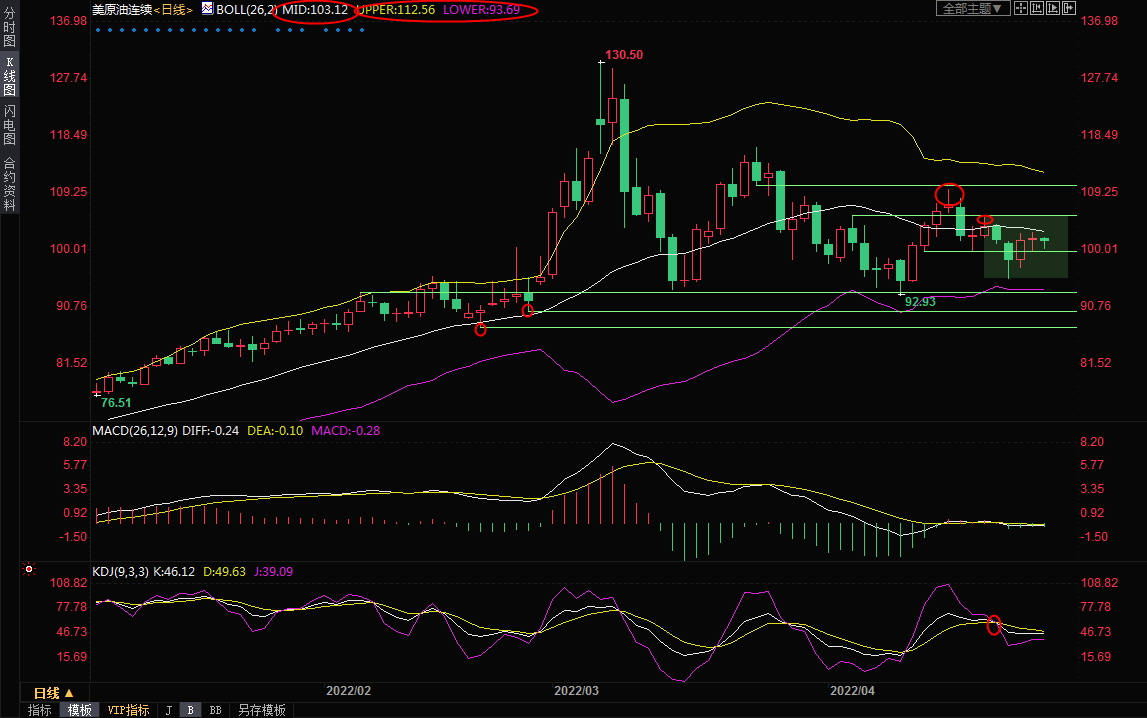 上方布林线中轨阻力在103.13附近,4月21日高点阻力在105.42附近,若能顶破该阻力,则增加短线看涨信号,目前可以参考布林线上轨112.56附近;当然,4月18日高点109.81附近也存在一些阻力。
