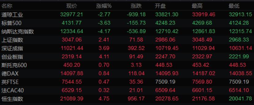 美股收盘情况:道琼斯指数收盘下跌970.77点,跌幅2.86%,报32945.62点;标普500指数收盘下跌151.70点,跌幅3.54%,报4135.80点;纳斯达克综合指数收跌536.89点,跌幅4.17%,报12334.64点。