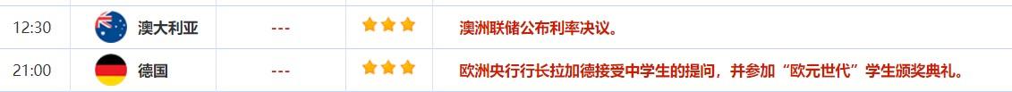 5月3日需关注澳洲联储利率决议。目前澳洲联邦银行料澳洲联储将等到6月再加息。澳洲联邦银行(CBA)经济研究部主管Gareth Aird在一份报告中称,本周公布的澳大利亚第一季度CPI数据显示物价普遍上涨,但5月很难加息。尽管如此,仍预期澳洲联储会保持其最近的指导方针,这给等待第一季度工资数据(定于5月中旬发布)带来压力。预计澳洲联储在6月将加息15个基点至0.25%。(澳新银行、澳大利亚国民银行和西太平洋银行均已转入预期澳洲联储5月加息的阵营。