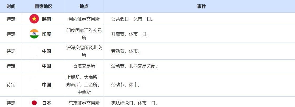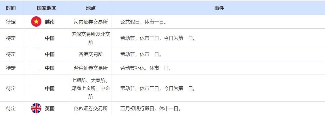 5月2日,还需关注劳动节中国市场休市公告,以及越南和英国和休市公告