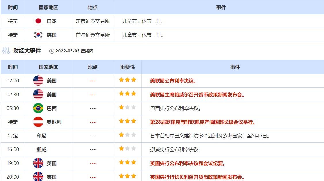 5月3日投资者还需关注当天全球各大交易所的休市公告。、
