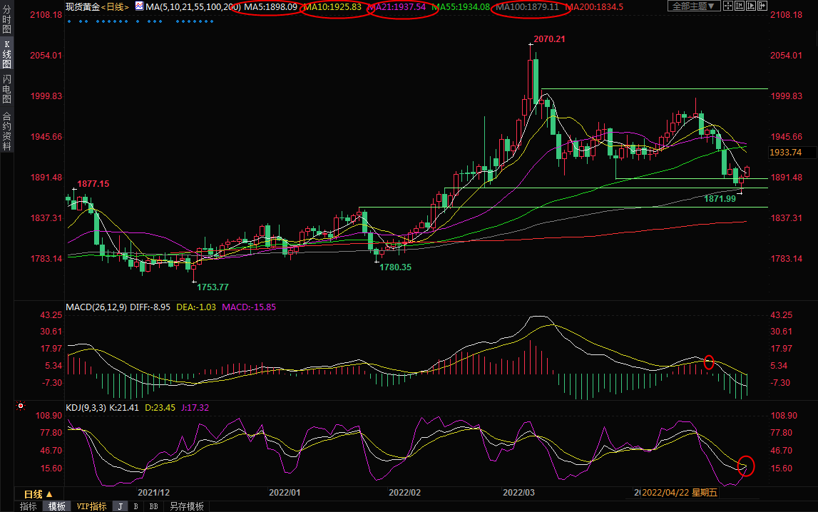 日线级别:震荡下跌后反弹;金价守住了100日均线,K线录得下影线小阳性,KDJ有金叉迹象,金价短线跌势中断,能否转为涨势还有待观察,初步阻力在4月26日高点1911.15附近,10日均线阻力在1925.79附近,若能收复该位置,则增加短线看涨信号;进一步阻力在21日举行1937.53附近。